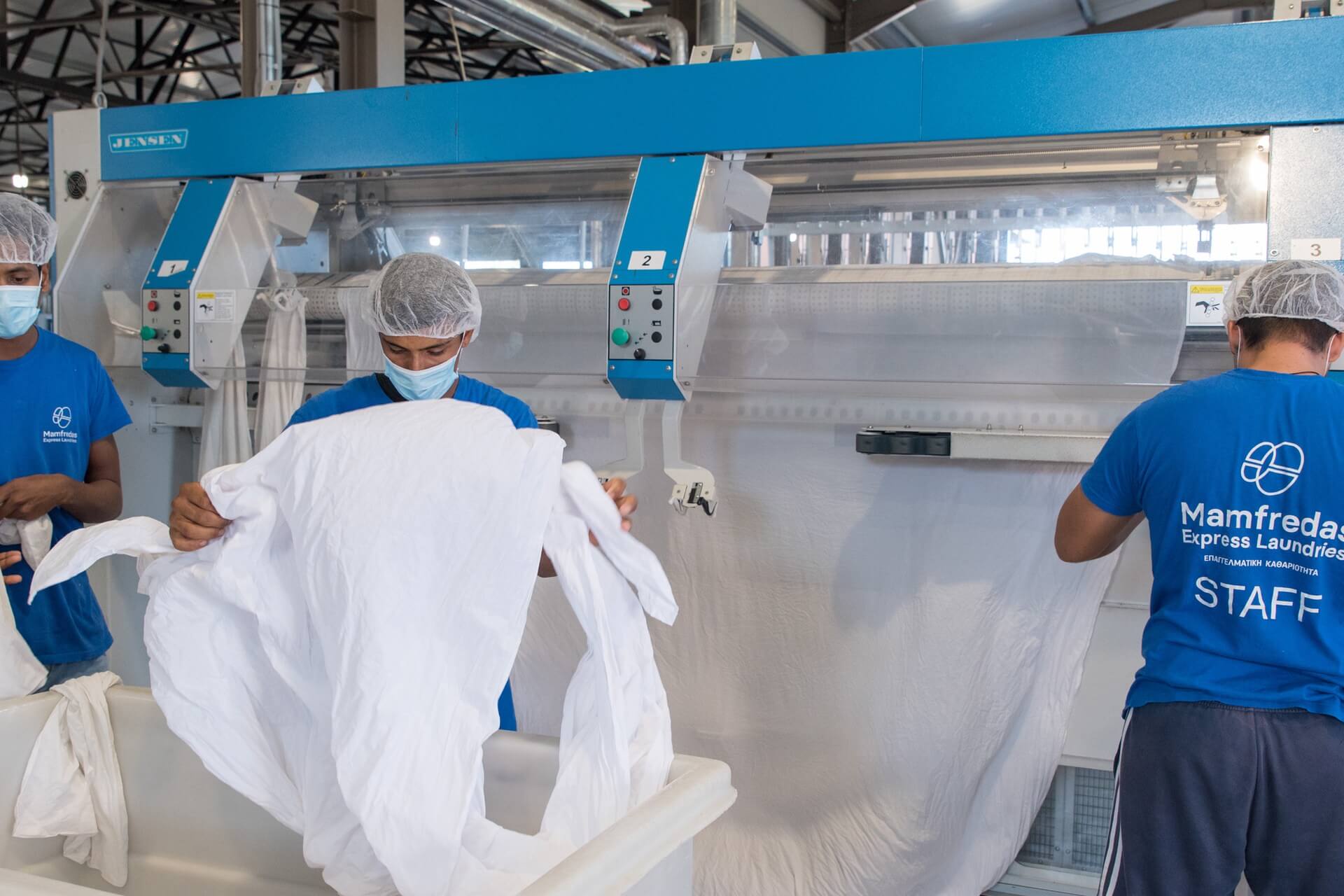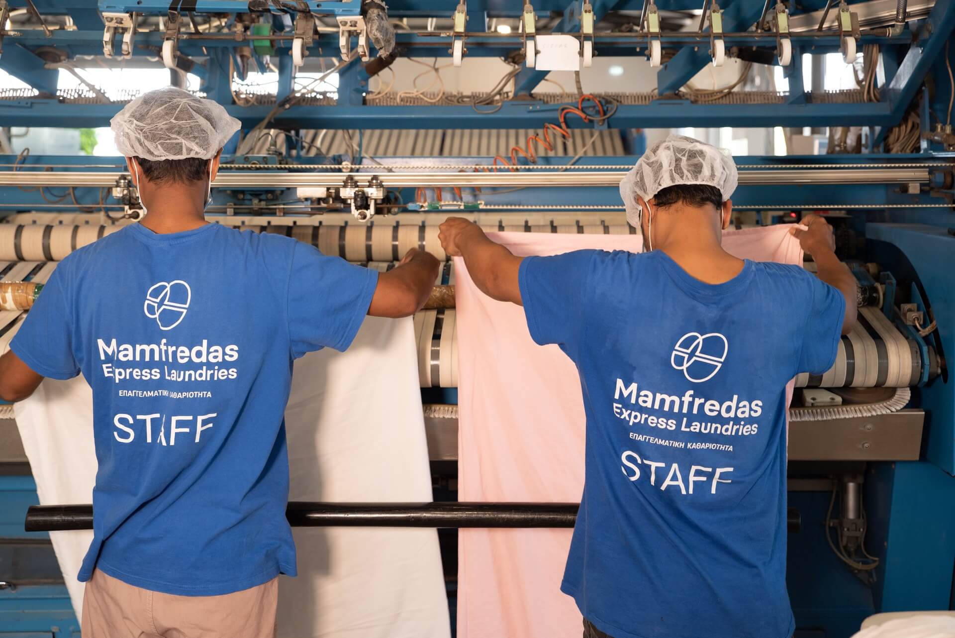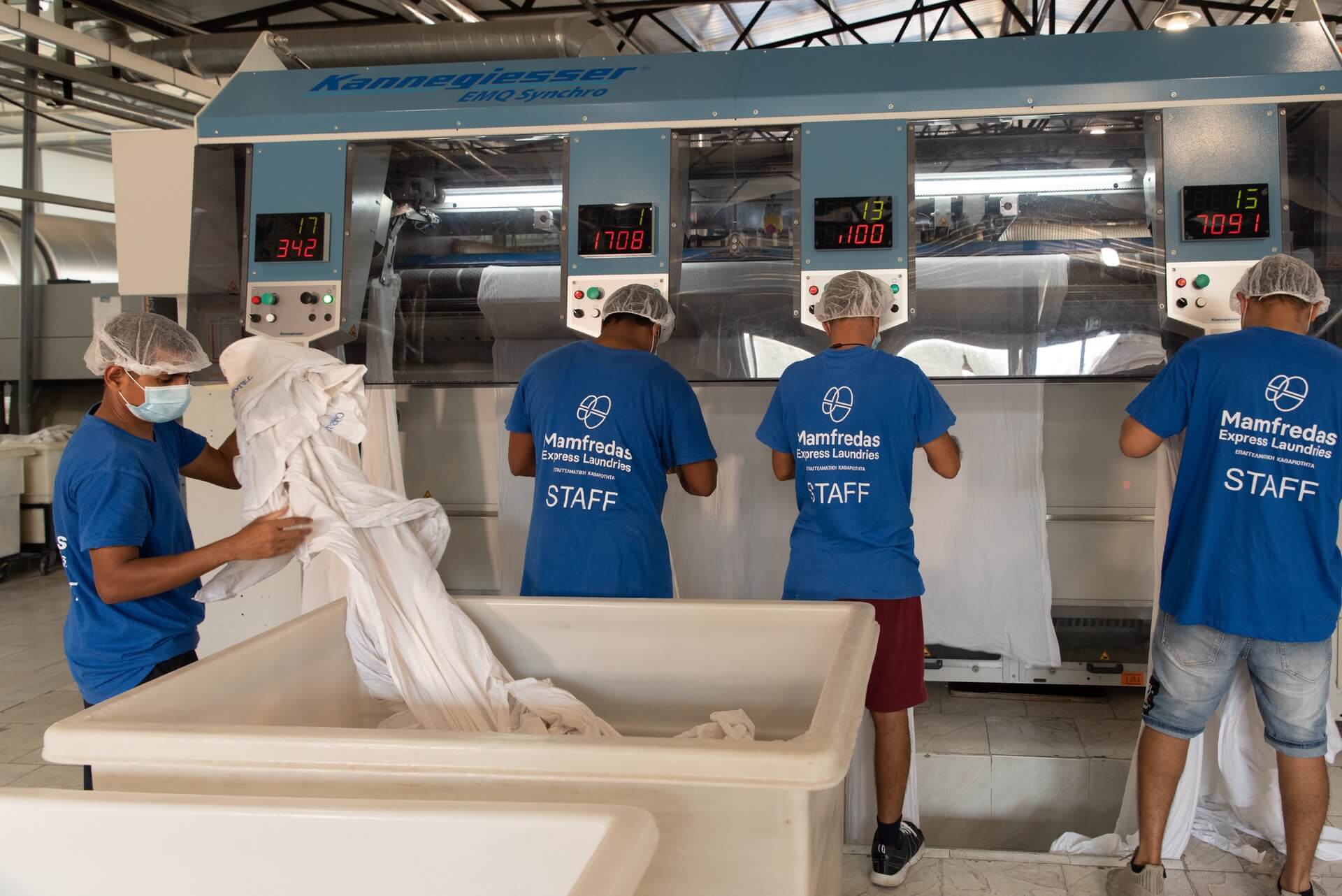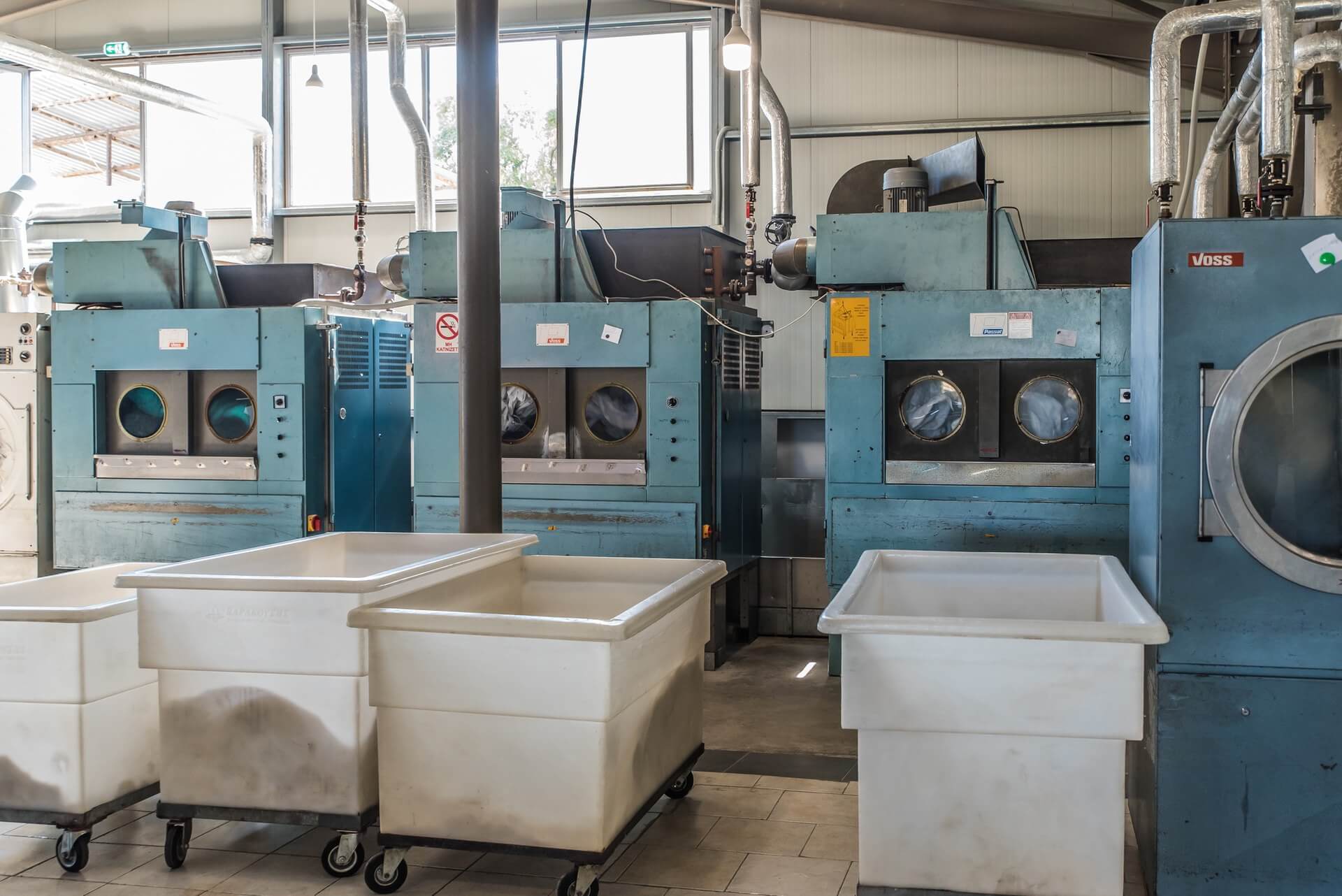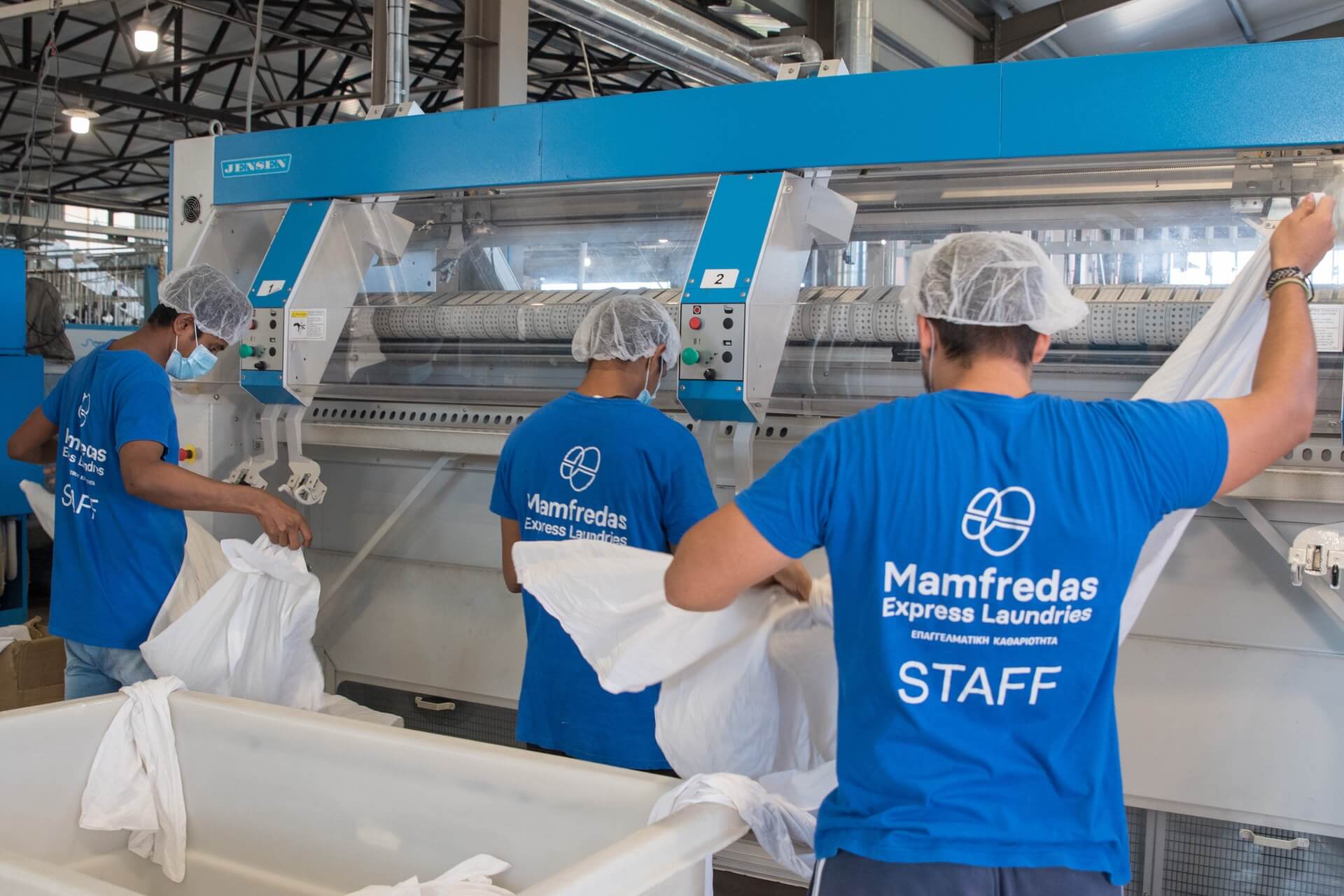 Τις σύγχρονες μονάδες πλύσης, στεγνώματος και σιδερώματος του ιματισμού διαχειρίζονται ημερησίως οι άριστα εκπαιδευμένοι εργαζόμενοί μας. Το προσωπικό μας αποτελείται από 50 και άνω εργαζομένους την περίοδο υψηλής παραγωγής, που εκπαιδεύονται διαρκώς σε νέες τεχνικές και τηρούν όλες τις προδιαγραφές υγιεινής και ασφάλειας.