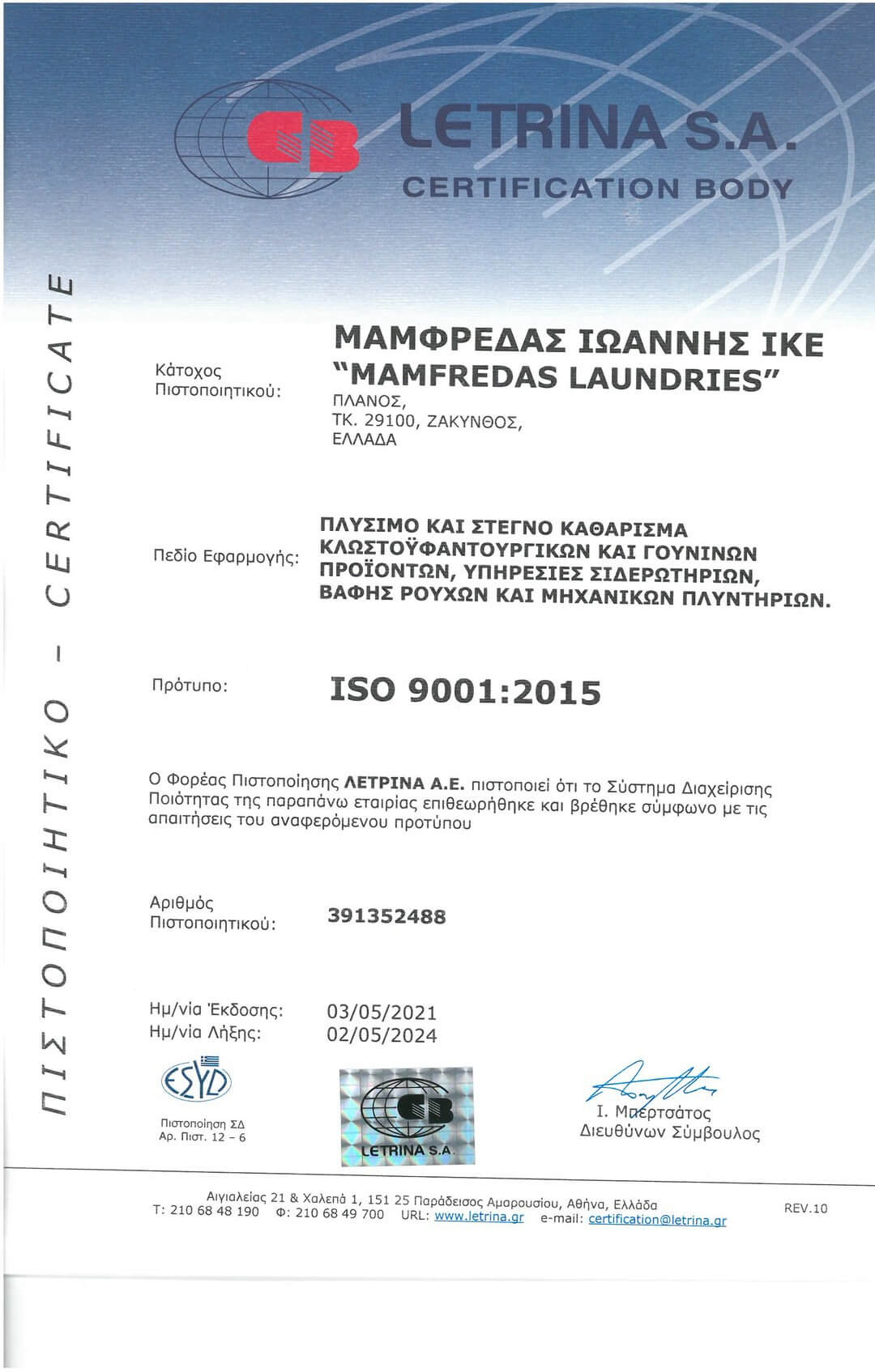 Οι σύγχρονες εγκαταστάσεις της Mamfredas Express Laundries στεγάζονται στην περιοχή πλάνος στο νησί της Ζακύνθου σε μια ιδιόκτητη έκταση 1.500 τετραγωνικών μέτρων εκ των οποίων τα 2/4 καλύπτονται από τον τομέα παραγωγής και τα γραφεία της επιχείρησης, ενώ στο υπόλοιπο τμήμα βρίσκονται τα γκαράζ των φορτηγών, τα μηχανήματα παροχής συμπιεσμένου αέρα, το λεβητοστάσιο, το συνεργείο μηχανημάτων και λοιποί βοηθητικοί χώροι.
